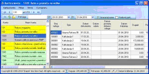 Izbor kartice : Selektovanjem određenog konta sa desne strane nam se prikazuju sva knjiženja na datom kontu, a u statusnoj liniji možemo videti stanja na dugovnoj i potražnoj strani.