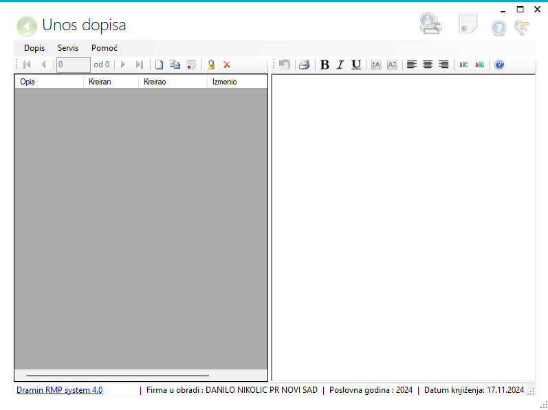 Ova forma se koristi za kreiranje i uređivanje različitih vrsta dokumenata, odnosno dopisa. To mogu biti pisma, izveštaji, zahtevi, ponude i drugi slični dokumenti.
